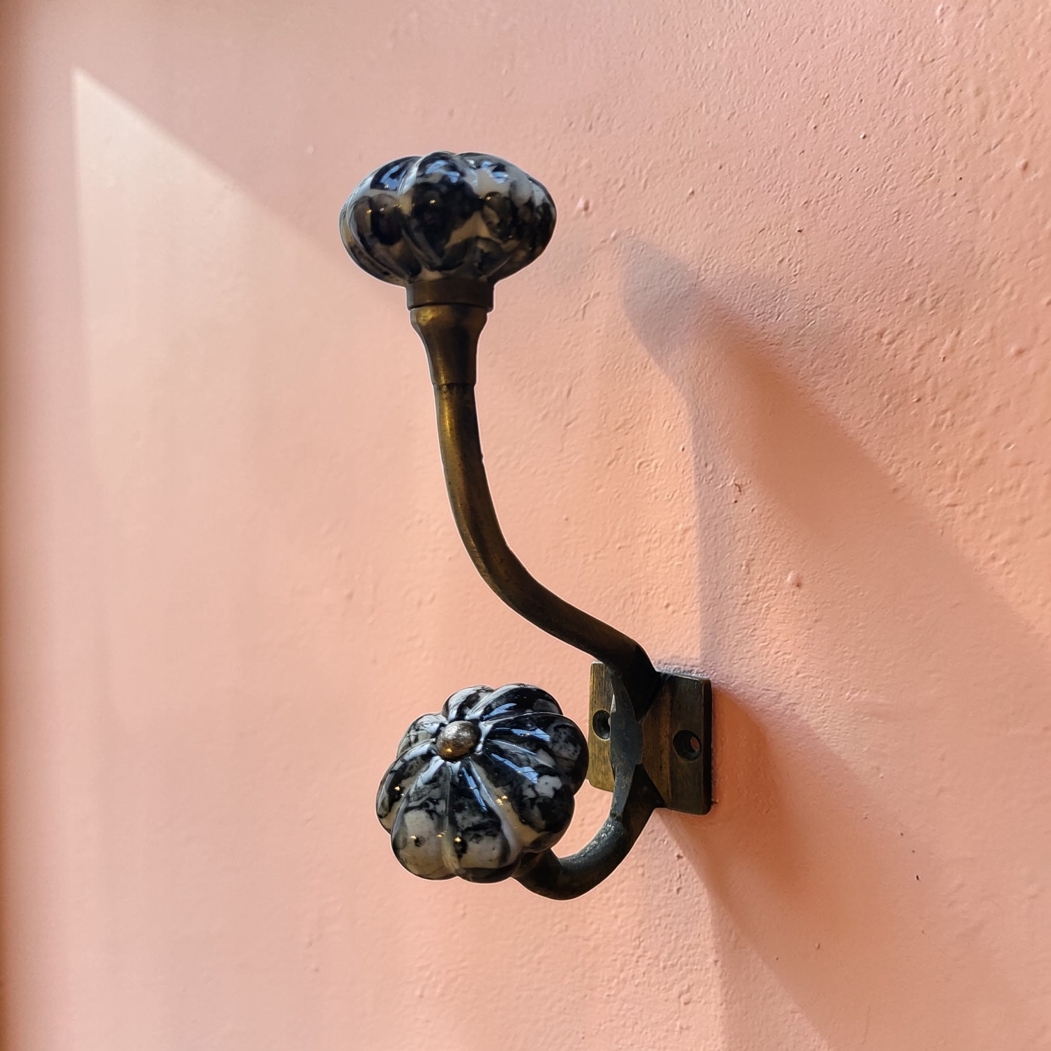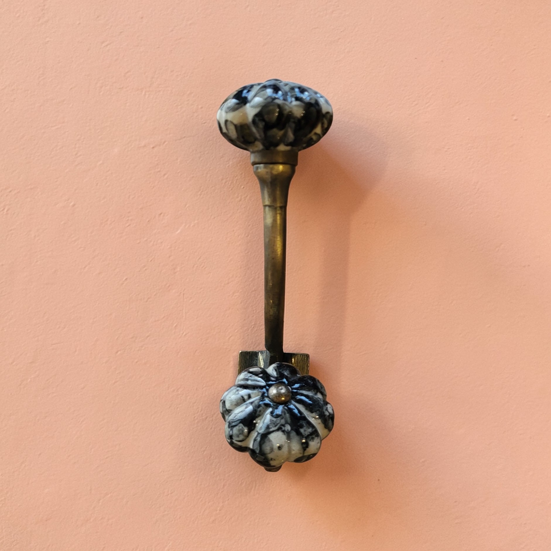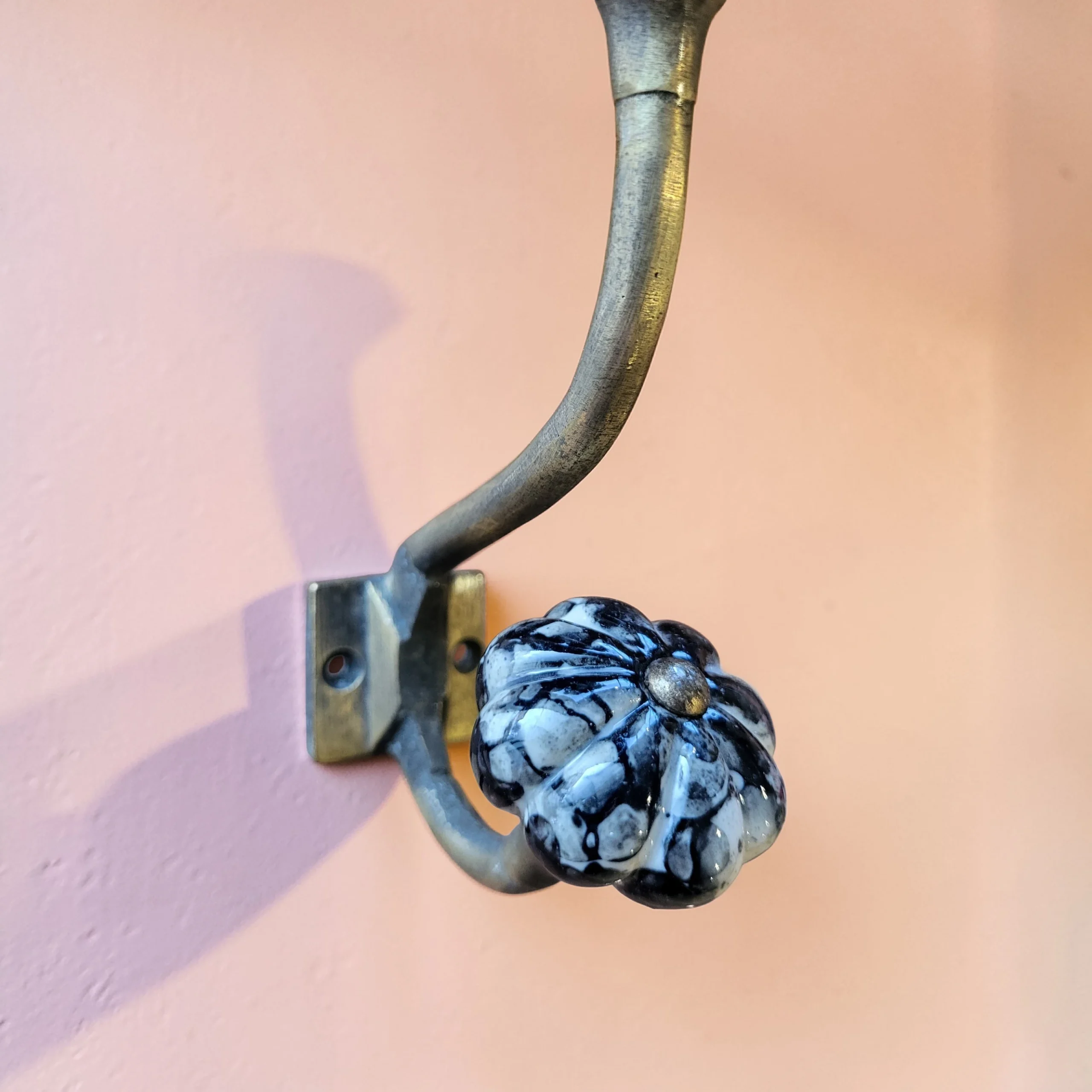 Add a touch of vintage charm to your home with this beautifully crafted ceramic and iron coat hook. Blending timeless materials with elegant design, each hook features a pair of handmade Marbled Black Flower ceramic knobs set atop our sleek antique bronzed hook.